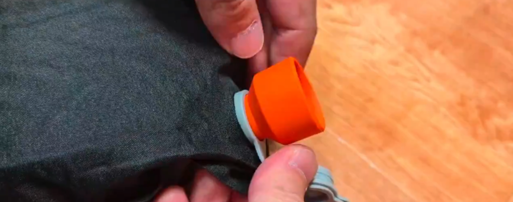 コールマンのマットに付属している「ポンプバッグ」の接続部分になら、フィンガーポンプのノズルをグッと押し込むことで、しっかりと固定して空気を送ることができました!