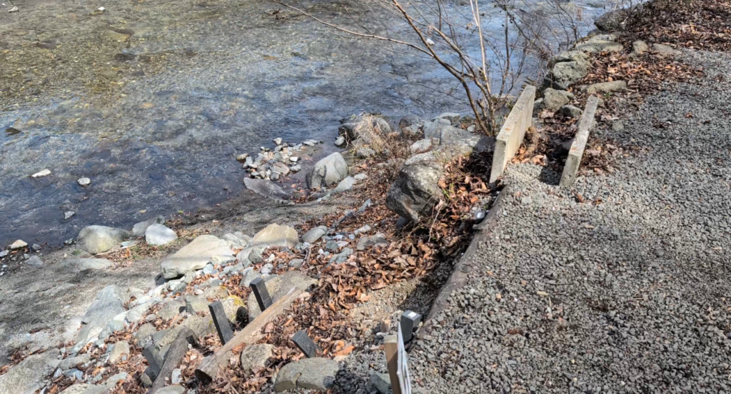 左側には川へ降りられる緩やかな道があります。