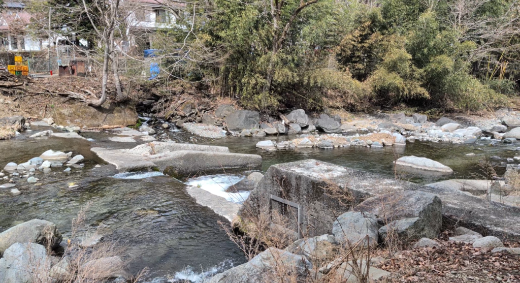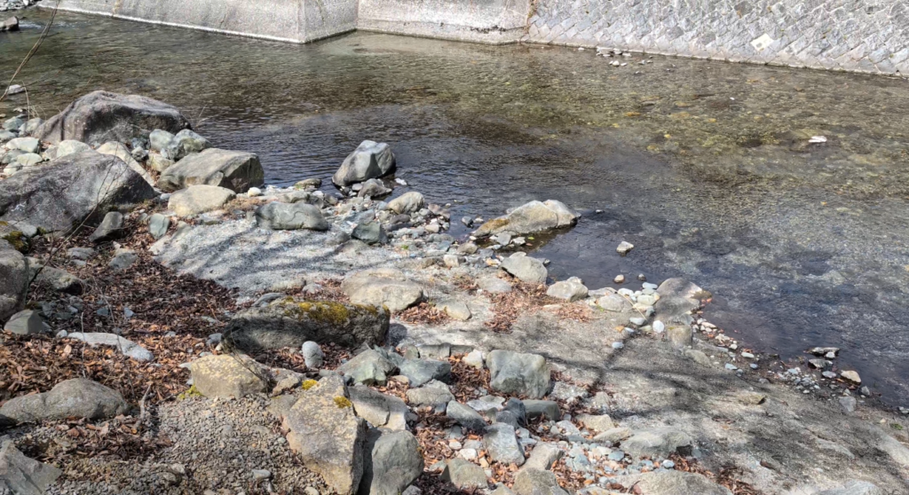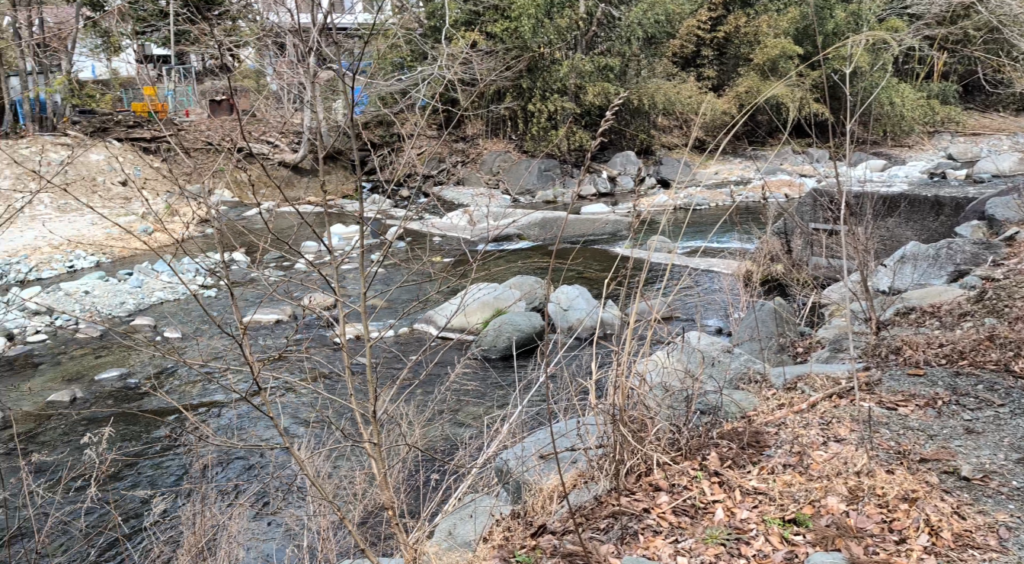 かなり横長で少し傾斜があるためレイアウトには工夫がいりますが、川へ直接降りやすく、流れも穏やか。