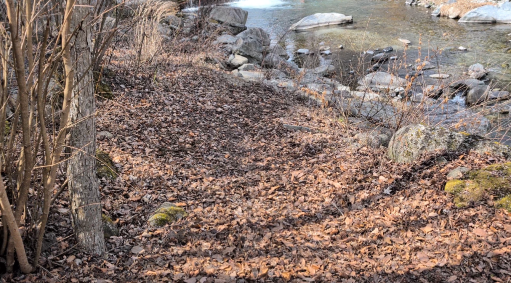 両端に木があるため車の配置次第で目隠しになりますが、川へ降りるには少し高さがあり急斜面です。