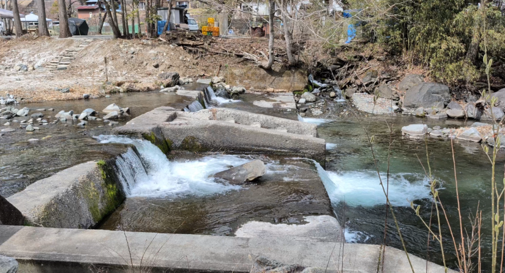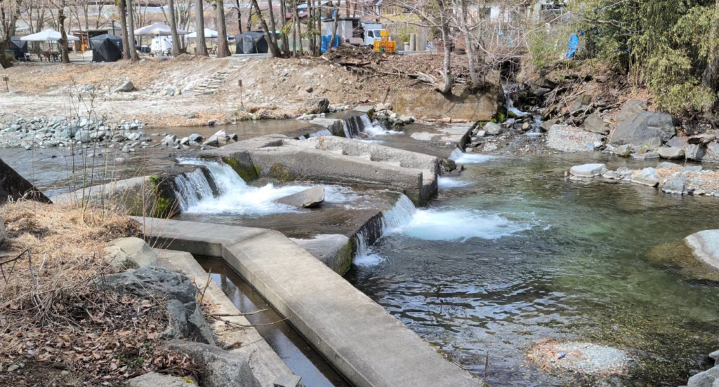 目の前が滝なので川の音が大きく、直接川へ降りるのは難しそうな地形です。